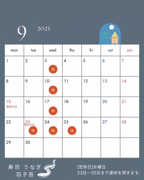 【羽子吾|創業1923年の伝統を味わう うなぎ・ひつまぶし・寿司の老舗】9月のお休みです。水曜日定休日2...