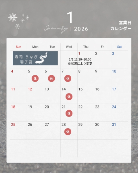 1月のお休み 2026-01-05 23:39:13 🎍 新年あけましておめでとうございます 🎍旧年中は寿司うなぎ羽子吾をご愛顧いただき誠にありがとうございました。本年も皆さまに美味しいお寿司とうなぎ、そして心地よいひとときをお届けできるよう努めてまいります。📅 1月のお休み・年始の営業についてはカレンダーをご確認ください。本年もどうぞよろしくお願いいたします。